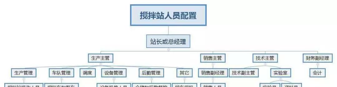 人員配置對于攪拌站來說非常重要,既要保證正常的生產(chǎn)用人,又不能造成人員浪費,根據(jù)攪拌站的經(jīng)營規(guī)模,設(shè)置不同的崗位類別,并配置不同的人數(shù),具體人員配置如下圖所示,圖中各崗位的人數(shù)需要根據(jù)攪拌站實際需要增減,如有其它相關(guān)業(yè)務(wù),可自行增設(shè)。
