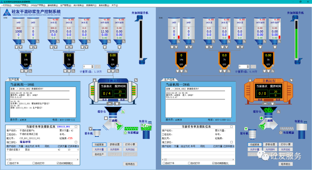 砼友干混砂漿(一機(jī)雙控)生產(chǎn)控制系統(tǒng), 可以實(shí)現(xiàn)一臺計(jì)算機(jī)控制兩條生產(chǎn)線,即把兩條生產(chǎn)線的控制功能集中到同一臺電腦的操作界面中完成,它具備以下特點(diǎn):